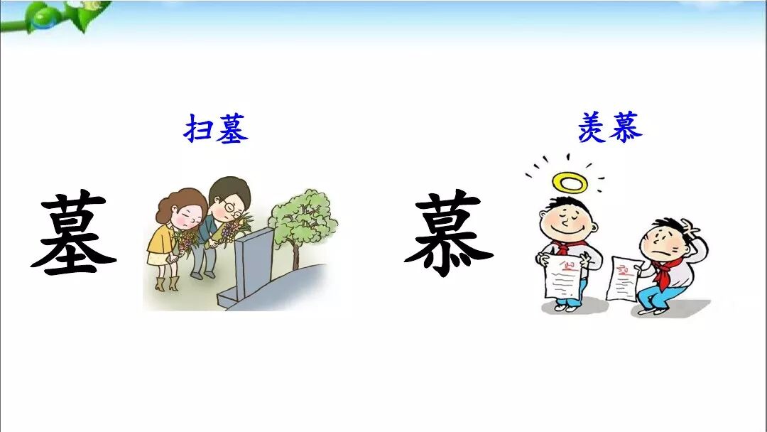“墓”就是墓地的意思,扫墓就是在碑墓前举行纪念活动 , 以表示对亡人的崇敬与怀念之情,所以“扫——墓”。