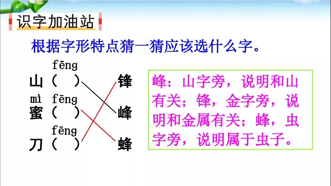“锋”是金字旁,与金属有关,左边与金属有关的是“刀”,所以“刀——锋”。