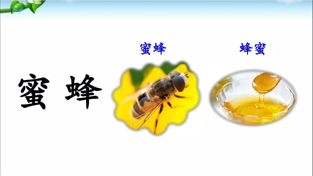 “蜜”字是虫字底,右边虫字旁的字是“蜂”,所以“蜜——蜂”。