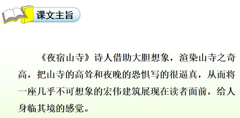 《夜宿山寺》诗人借助大胆想象,渲染山寺之奇高,把山寺的高耸和夜晚的恐惧写的很逼真,从而将一座几乎不可想象的宏伟建筑展现在读者面前,给人身临其境的感觉。