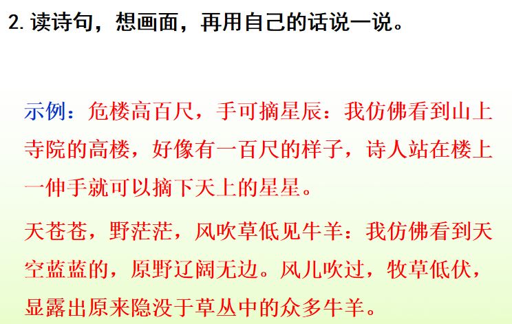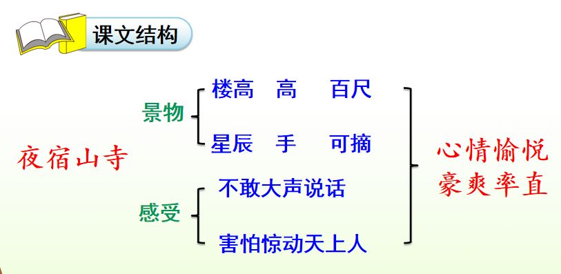 1.《夜宿山寺》:山上寺院的高楼真高啊,好像有一百尺,人在楼上好像一伸手就能摘下天上的星星。站在这里,我不敢大声说话,唯恐(害怕)惊动天上的神仙。