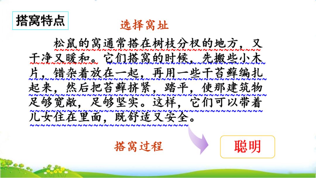 (3)行为特征——乖巧。松鼠聪明有智慧,行动轻快敏捷。松鼠搭窝时精心考究,搭出的窝既坚实又舒适。