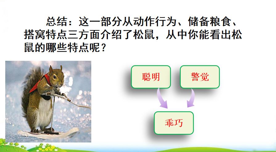 本文以生动传神的描写及准确而简练的说明,介绍了松鼠漂亮的外形、驯良的性格和乖巧的行为,突出表现了松鼠讨人喜爱的特点,表达了作者对松鼠的喜爱之情。