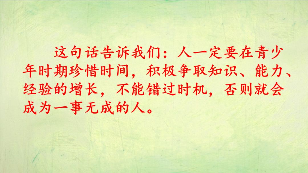 这句话告诉我们:人一定要在青少年时期珍惜时间,积极汲取知识、提高能力、增长经验,不能错过成长成才的最佳时机。