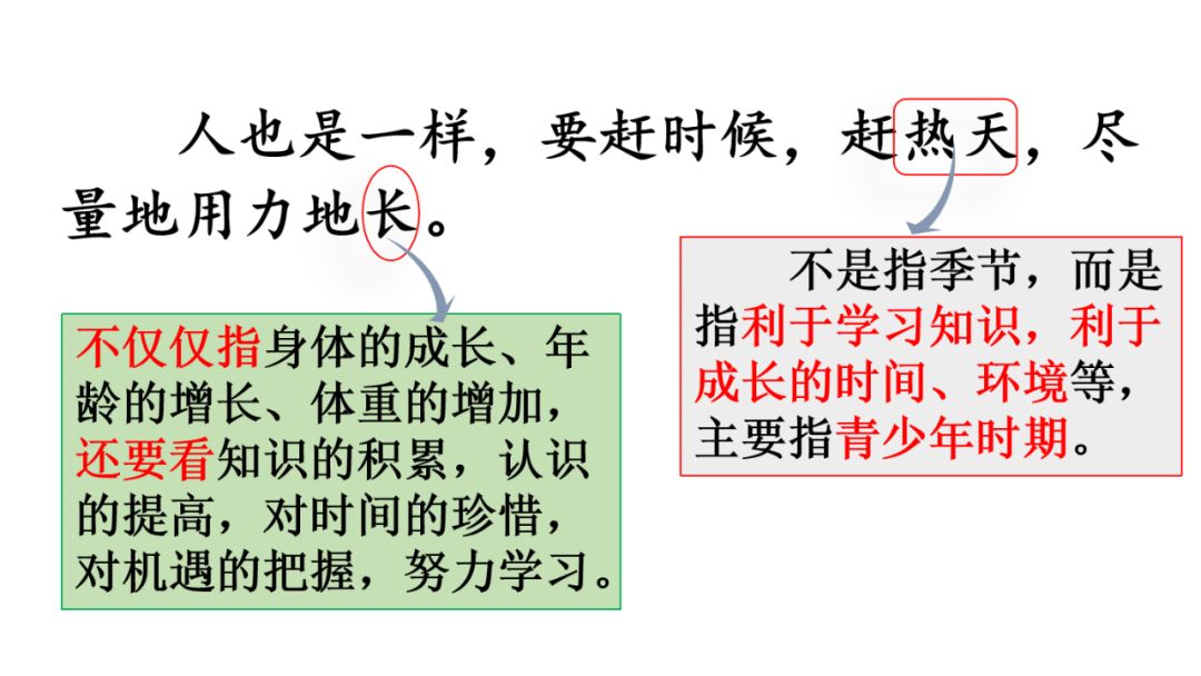 3、“人也是一样,要赶时候,赶热天,尽量地用力地长。”这句话告诉了我们什么?