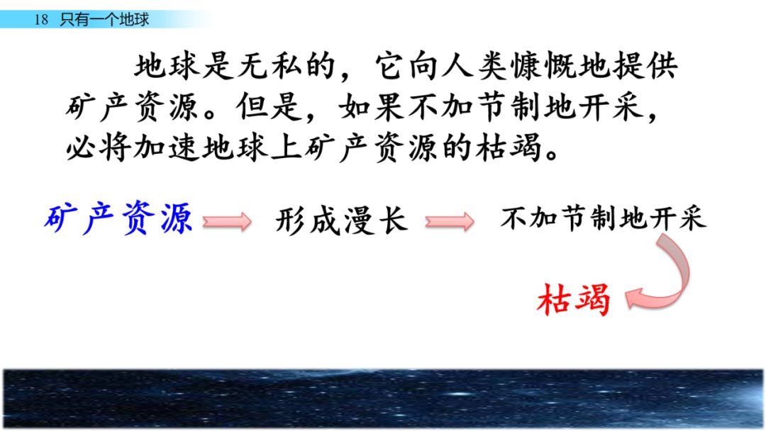 课文先从宇航员在太空遥望地球所看到的景象写起,引出了对地球的介绍;接着从地球在宇宙中渺小、地球所拥有的自然资源有限而又被不加节制地开采和随意毁坏等方面,说明地球面临着资源枯竭的威胁;然后用科学家研究的成果证明,当地球资源枯竭时,人类无法移居到第二个适合的星球上;最后告诉人们:人类应该精心保护地球,保护地球的生态环境。