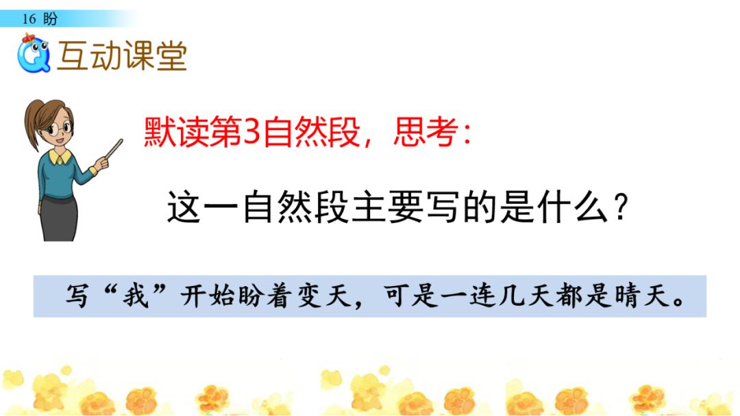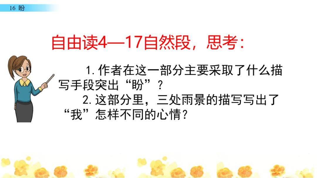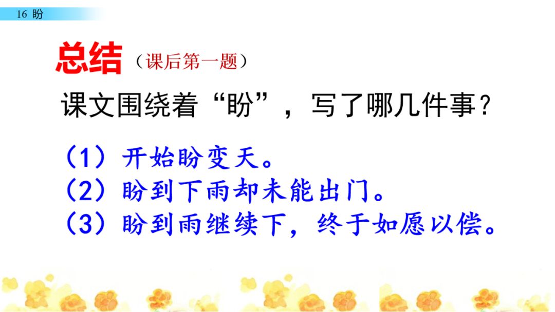 答:(1)走在放学路上盼着变天。(2)放学回家时天上下了几个雨点儿,盼着出去买酱油。(3)继续寻找借口出门,盼着雨别停。(4)吃过晚饭,没有机会出门,怕雨下完了明天就没有雨下了,又盼着雨停。