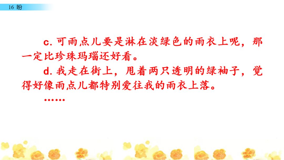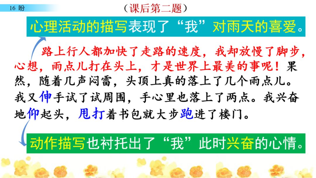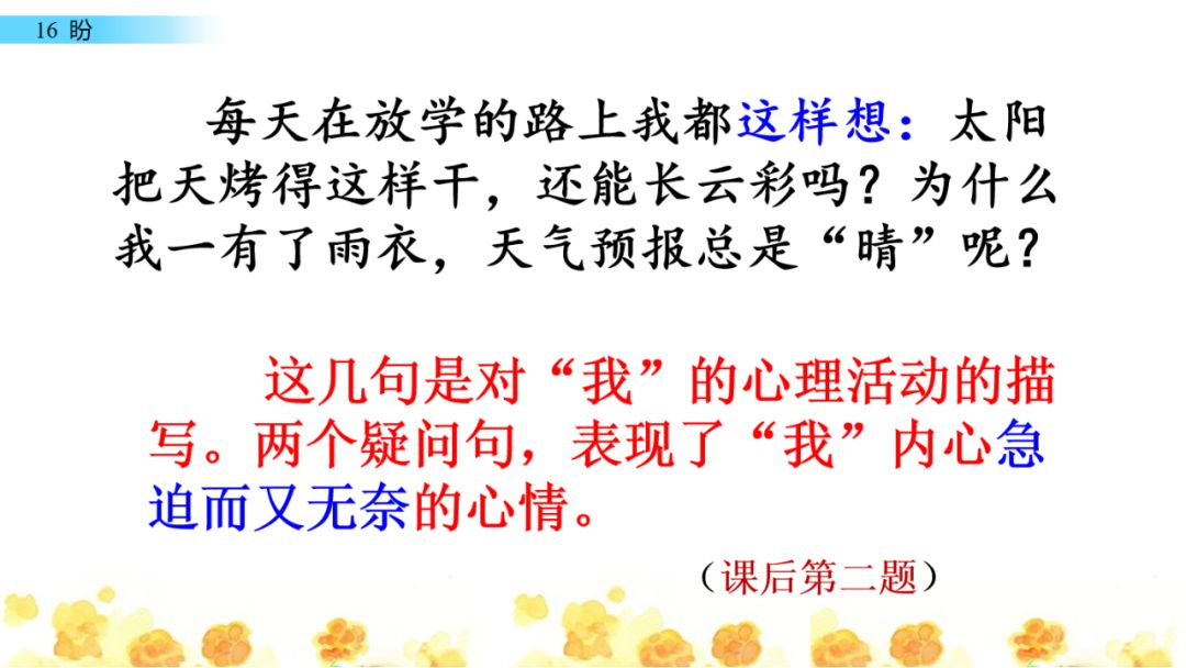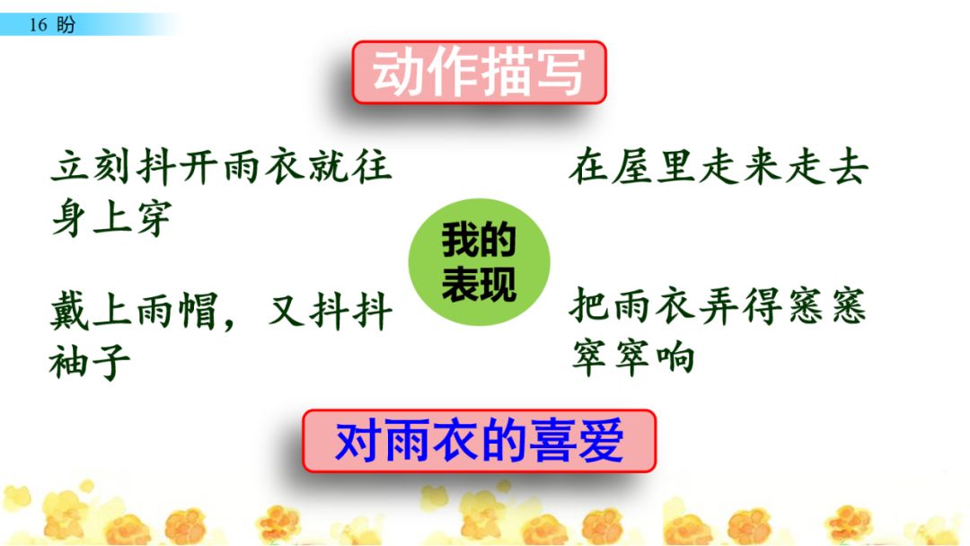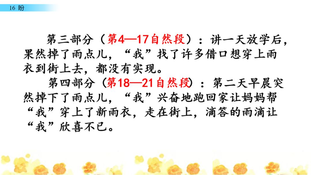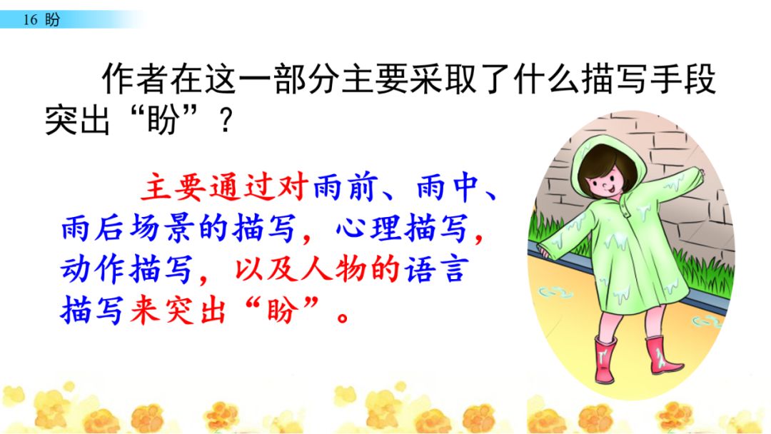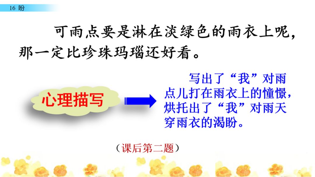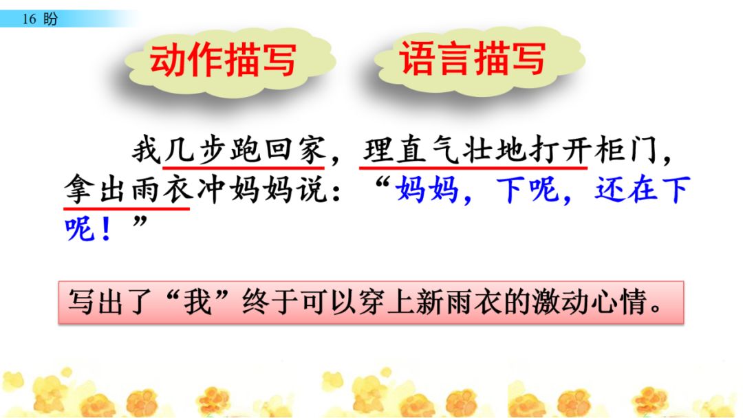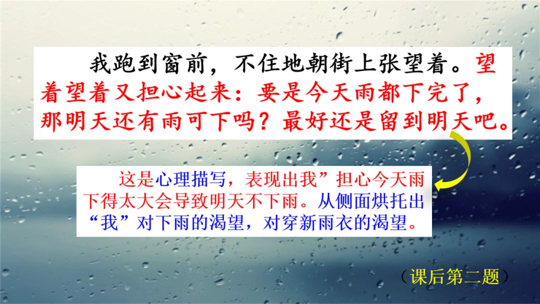 答:“我”盼着下雨,盼着穿上新买的雨衣,盼着体验雨点打在雨衣上的感觉。