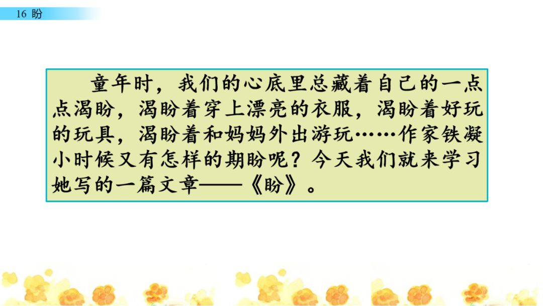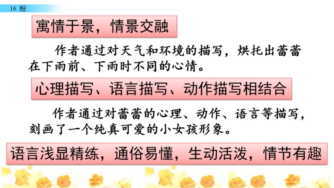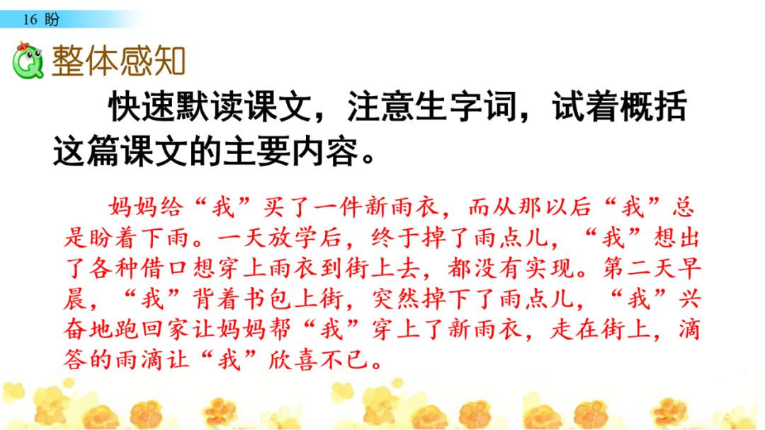 这篇课文主要写妈妈送“我”一件雨衣,然后“我”开始盼望下雨穿雨衣,最终在雨天穿上雨衣的故事。课文围绕一个“盼”字刻画了一个天真、可爱的儿童形象,表现出孩子们对美好事物的憧憬和盼望。