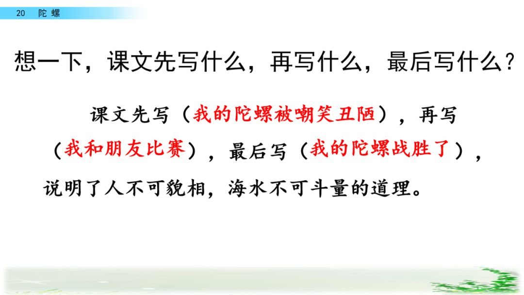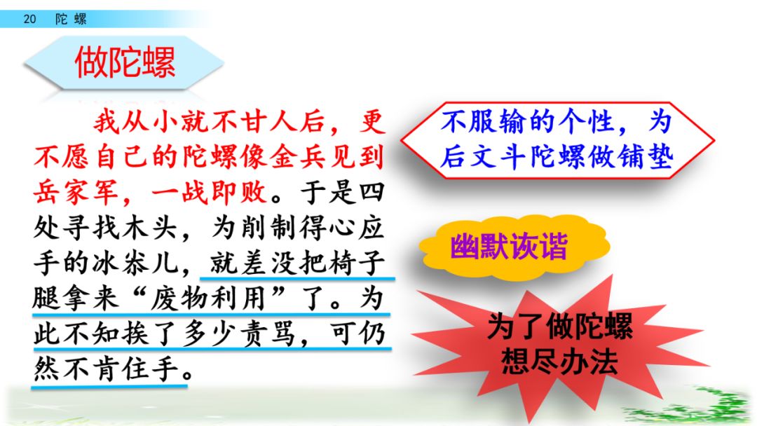 本文以陀螺为线索,主要叙述了作者的一只其貌不扬的小陀螺战胜大陀螺的事情,作者从中悟到了一个深刻的道理,体会到了成长中的快乐,表达了对陀螺的喜爱之情。作者以儿童的眼光和心理去观察事物、描写事物,字里行间充满了童真童趣。