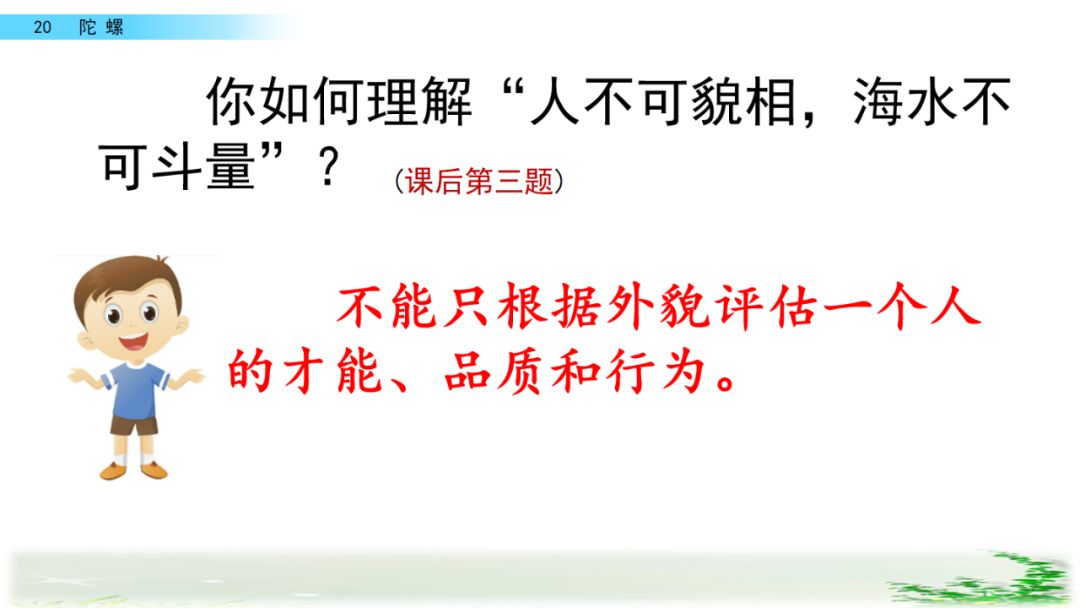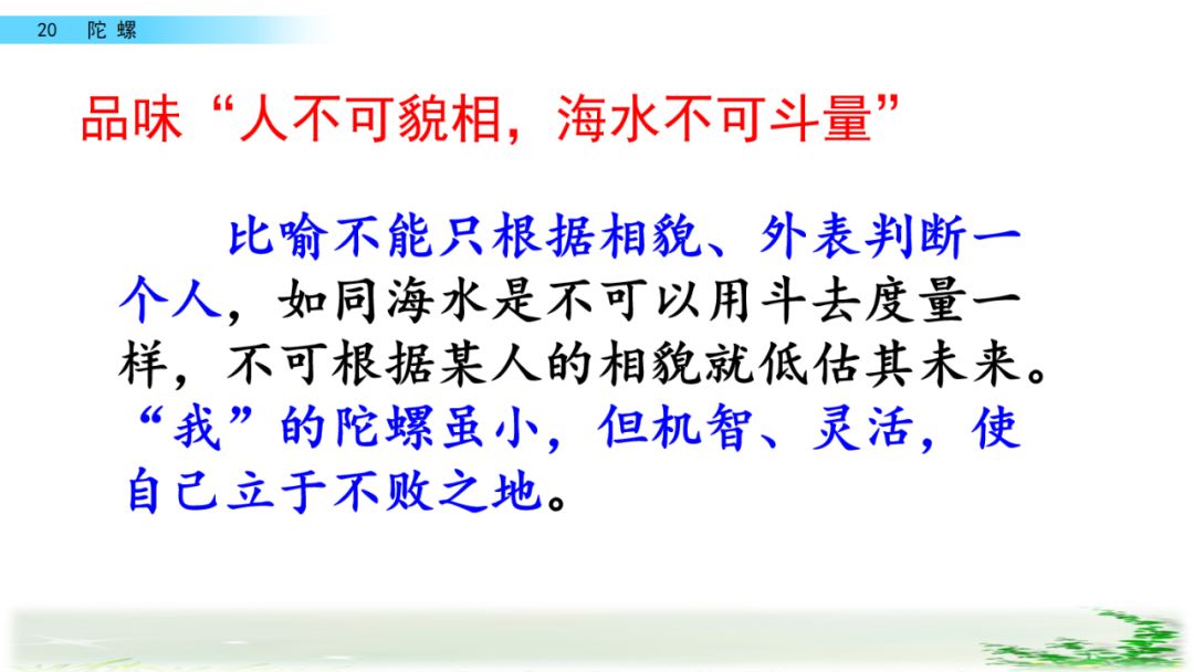 比喻不能只根据相貌、外表判断一个人,如同海水是不可以用斗去度量一样,不可根据某人的相貌就低估其未来。“我”的陀螺虽小,但机智、灵活,使自己立于不败之地。 所以说不能只根据外貌评估一个人的才能、品质和行为。