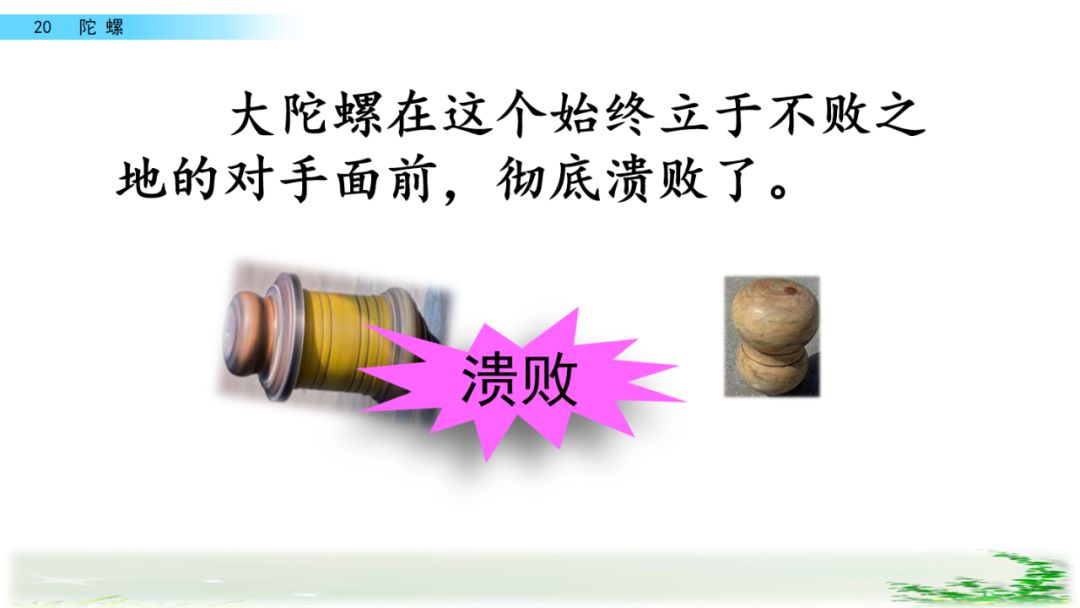 溃败:(军队)被打垮。文中指大陀螺被“我”的小陀螺打败了。