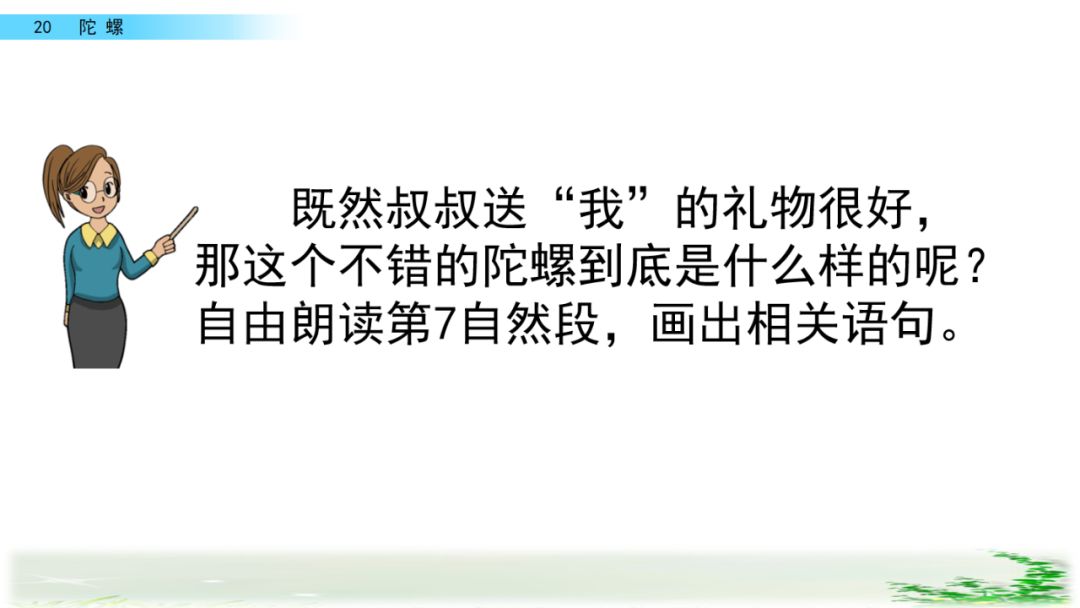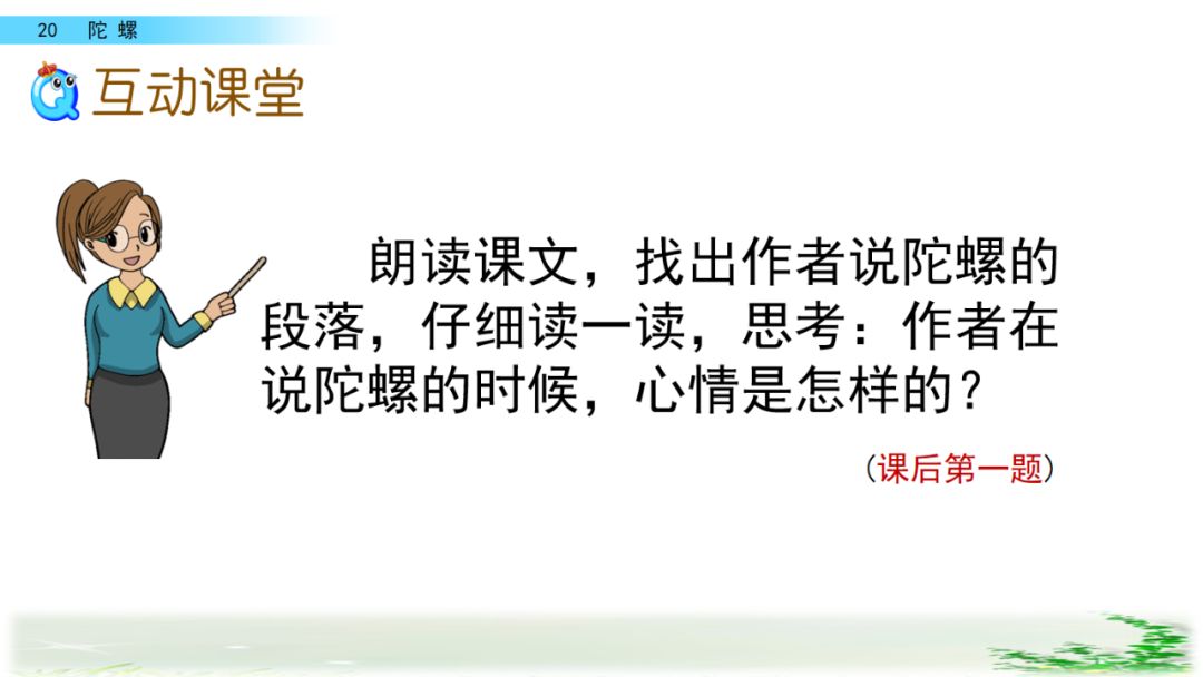 1、朗读课文,找出作者说陀螺的段落,仔细读一读,思考:作者在说陀螺的时候,心情是怎样的?