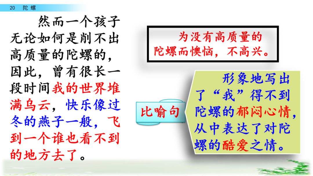 (1)因此,曾有很长一段时间我的世界堆满乌云,快乐像过冬的燕子一般,飞到一个谁也看不到的地方去了。(为没有高质量的陀螺而懊恼,不高兴。)