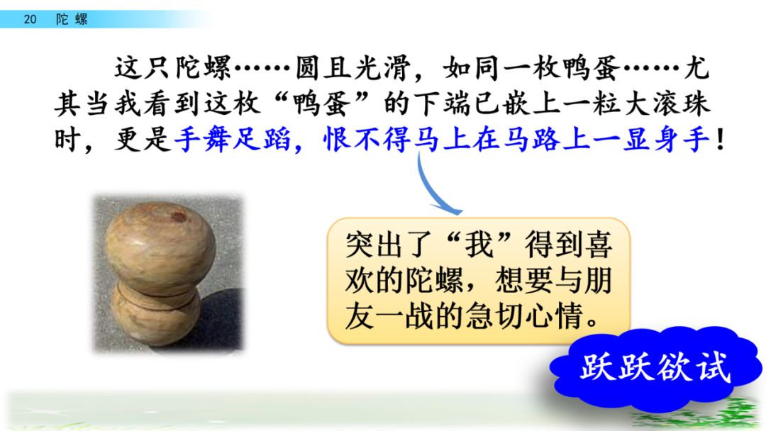 这个句子突出了“我”得到喜欢的陀螺,想要与朋友一战的急切心情。