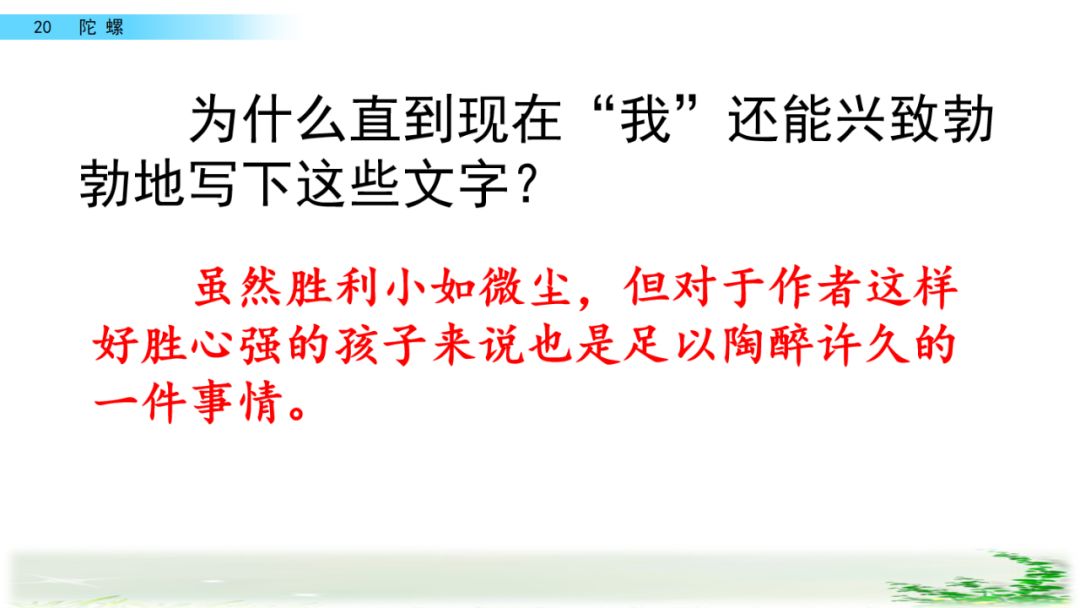 虽然胜利小如微尘,但对于“我”这样好胜心强的孩子来说也是足以陶醉许久的一件事情,句子写出了“我”当时十分高兴的心情。