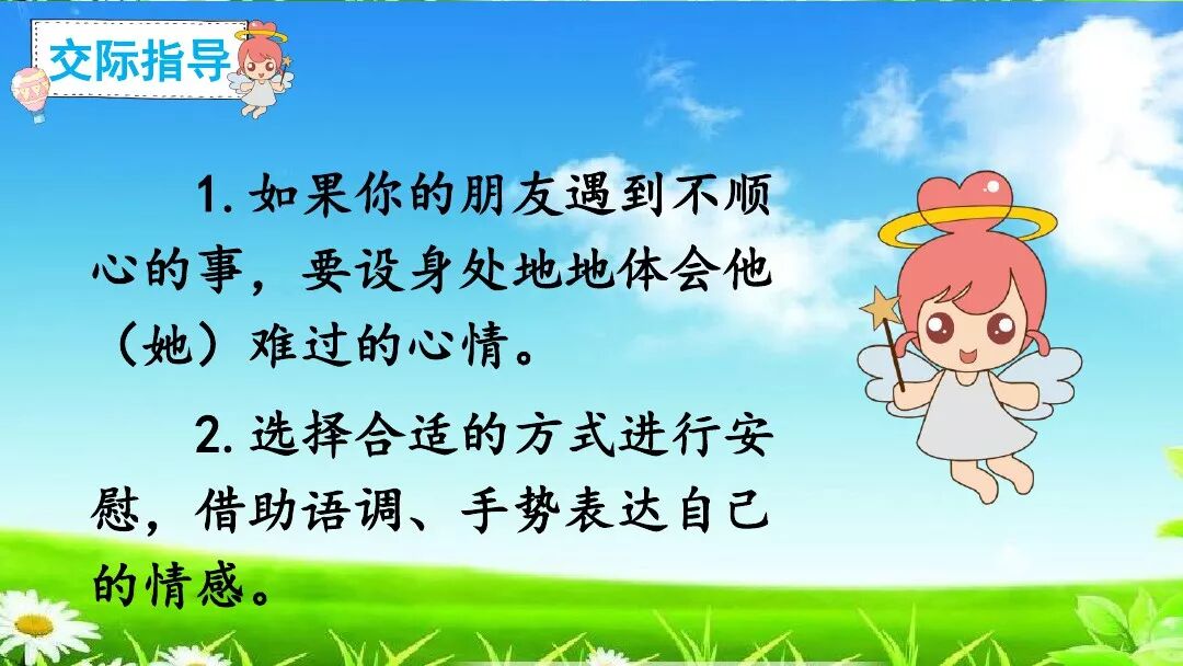 2.与同学合作,尝试扮演不同的角色,表演安慰他人的情景。安慰别人时要注意以下几个方面:①要选择合适的方式真心实意地安慰别人;②说话要委婉动情;③组织好语言,条理要清晰,可多说鼓励的话;④安慰他人时,可以借助语调、手势等恰当地表达自己的情感。
