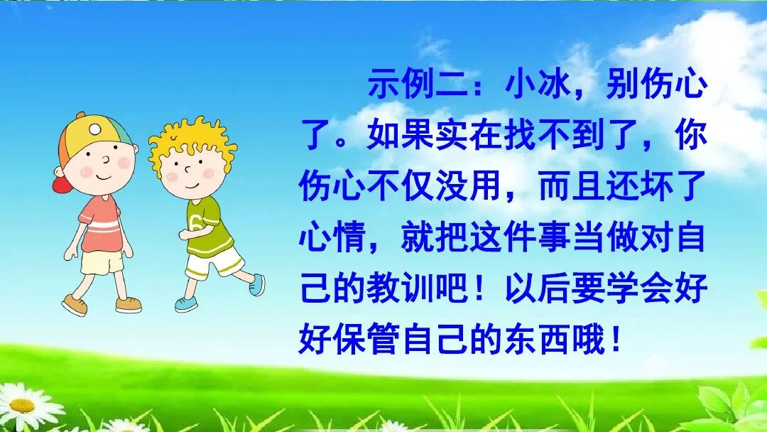 1.抓住问题的关键,思考在日常生活中应该怎样安慰别人,可任选一种情形进行重点思考。
