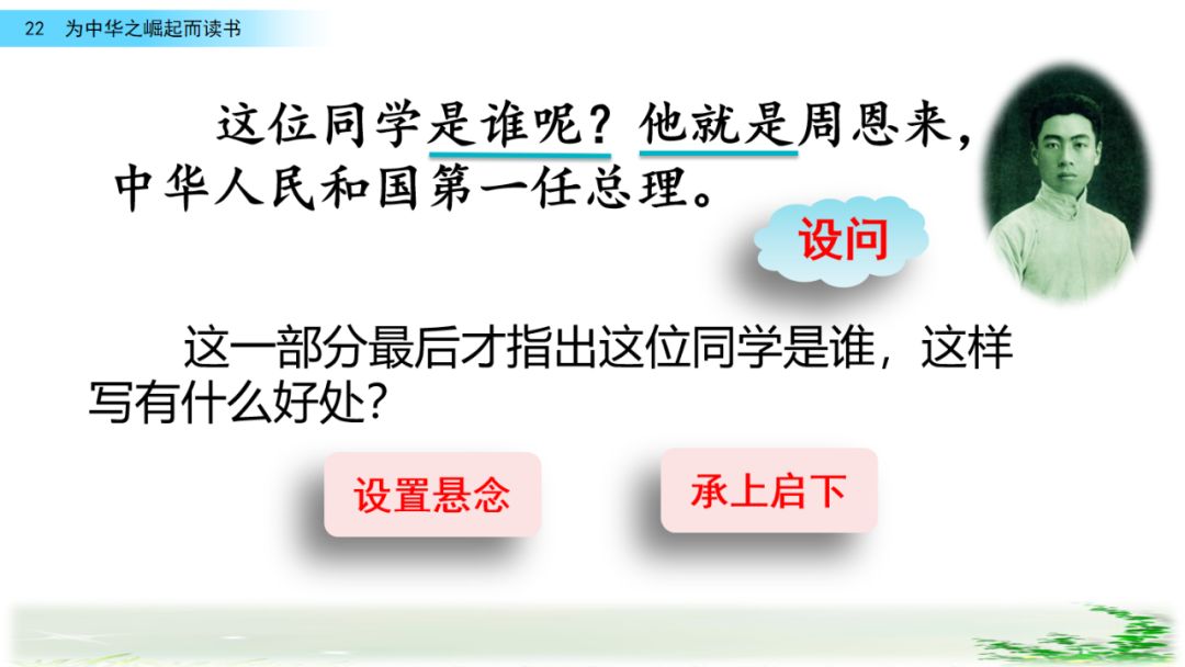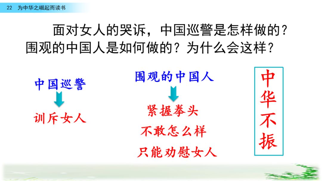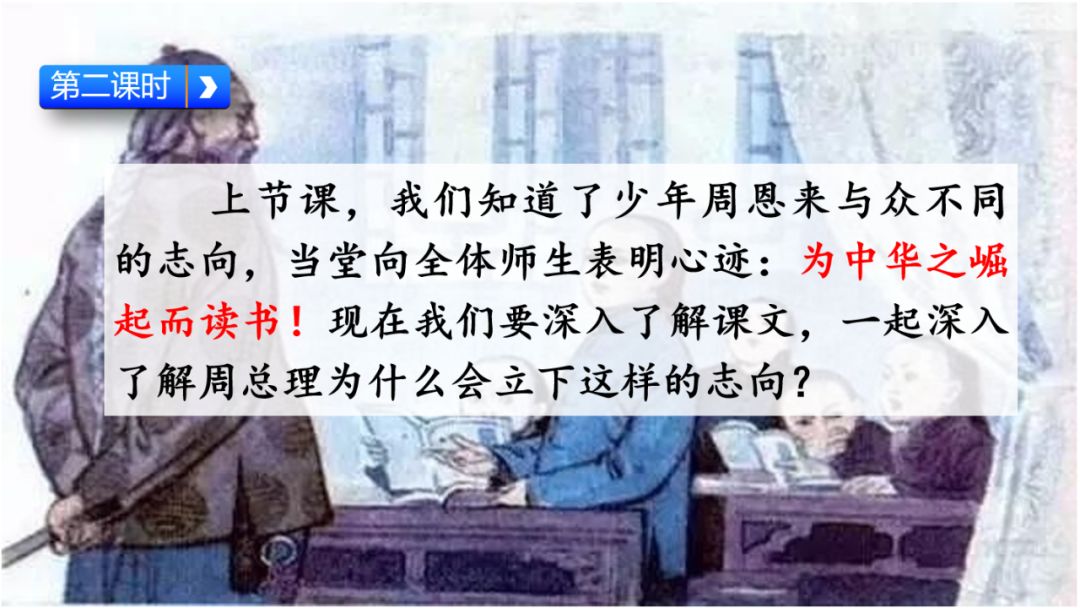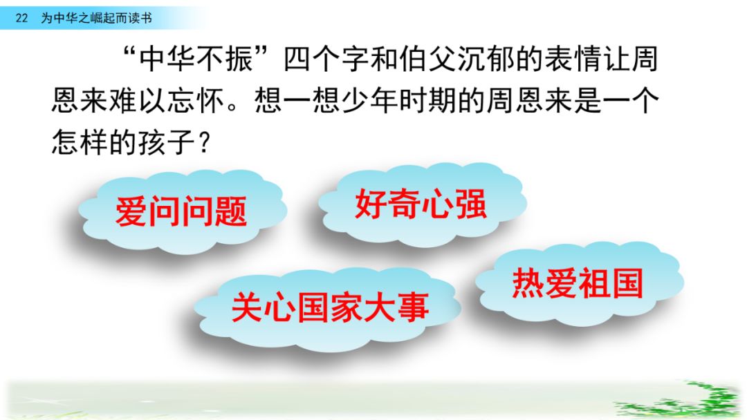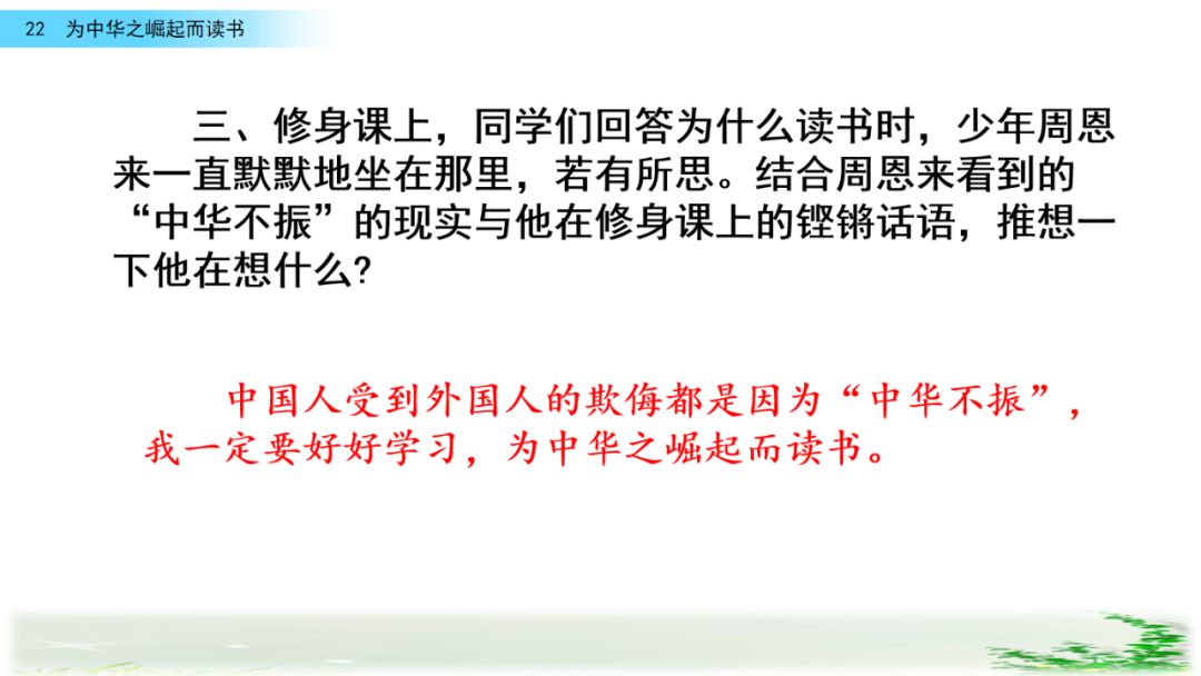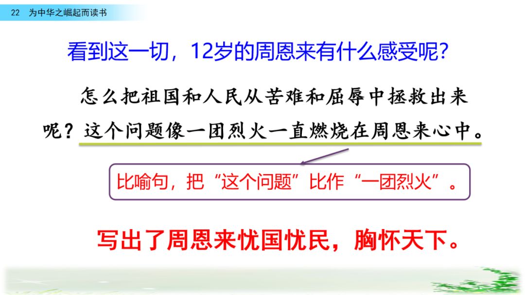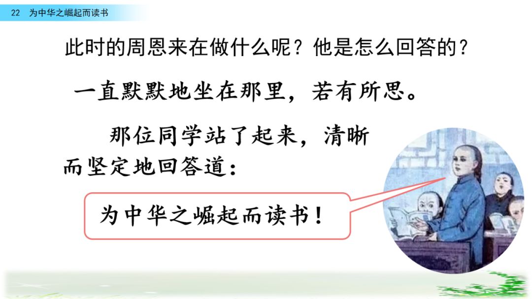 此时的周思来才真正体会到“ 中华不振”这四个字的沉重(chóng zhòng)分量(liang liáng)。怎么把祖国和人民从苦难(nán nàn)和屈辱中拯救出来呢?这个问题像一团(烈 列)火一直燃烧在周思来心中。所以,当修身课上魏校长(提 题)出为什么而读书这个问题时,就有了“为中华之崛起而读书”的响亮回答。