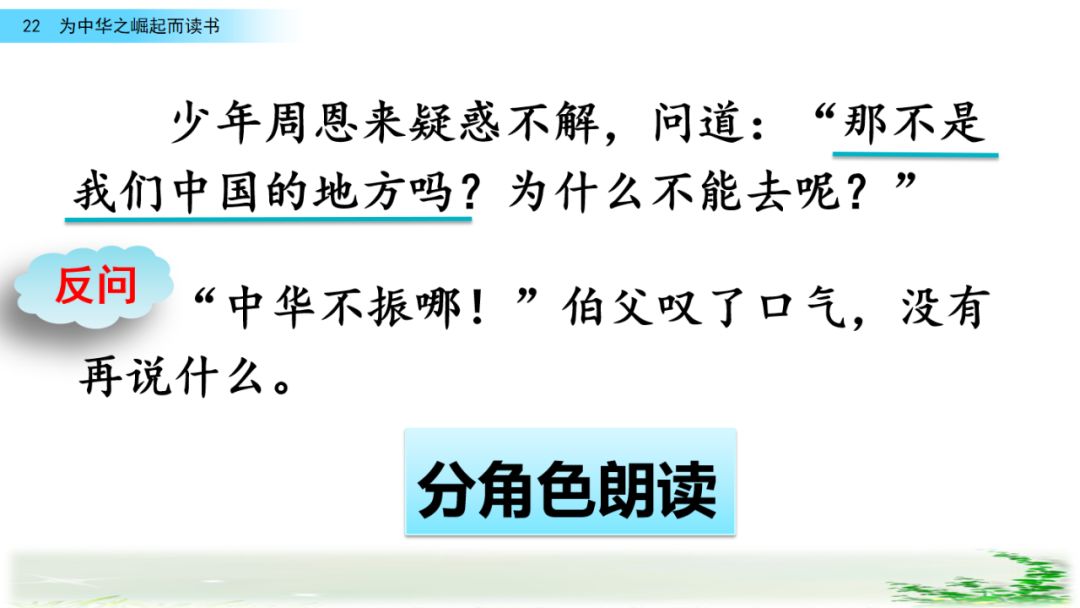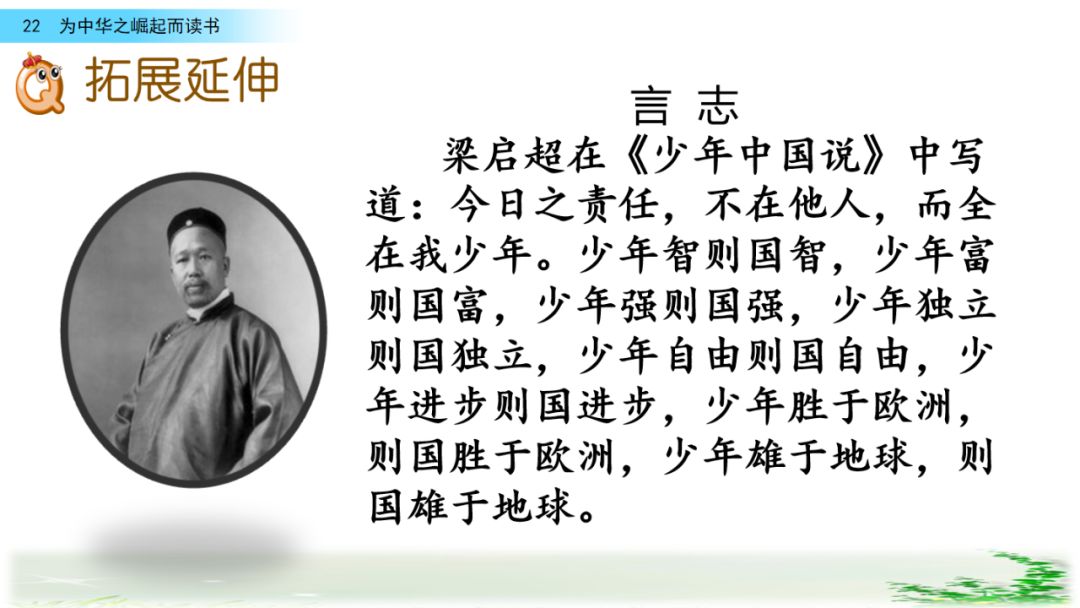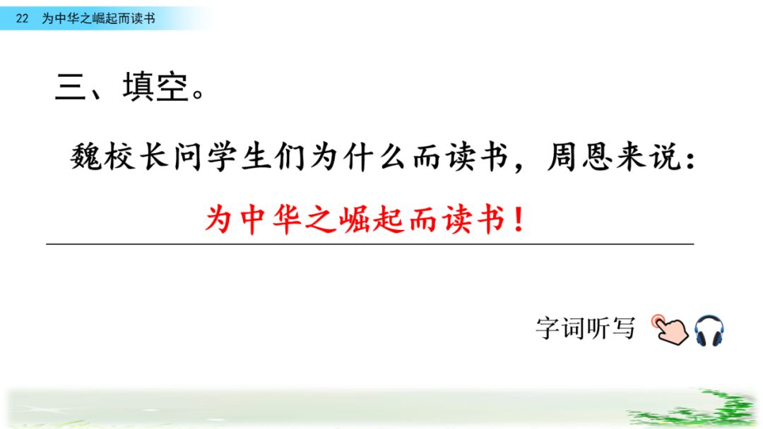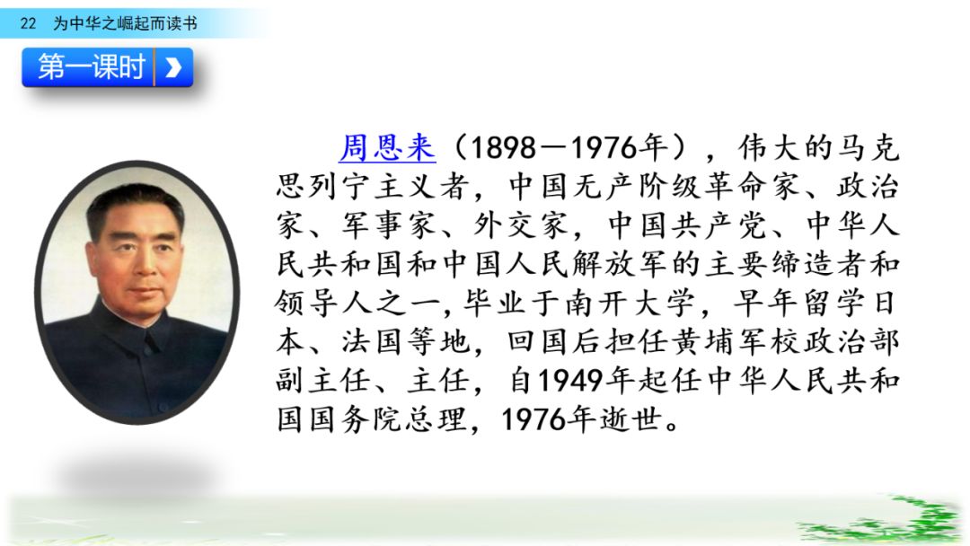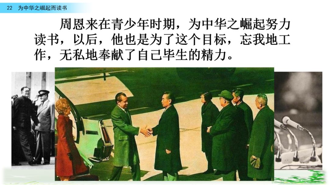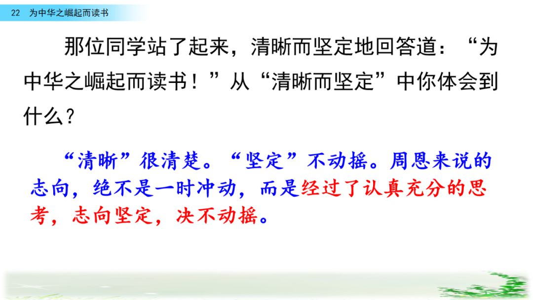此时的周思来才真正体会到“ 中华不振”这四个字的沉重(chóng zhòng)分量(liang liáng)。怎么把祖国和人民从苦难(nán nàn)和屈辱中拯救出来呢?这个问题像一团(烈 列)火一直燃烧在周思来心中。所以,当修身课上魏校长(提 题)出为什么而读书这个问题时,就有了“为中华之崛起而读书”的响亮回答。