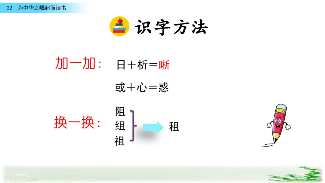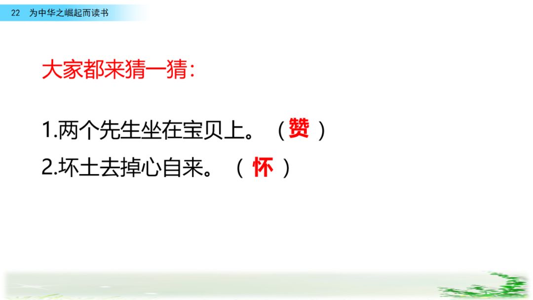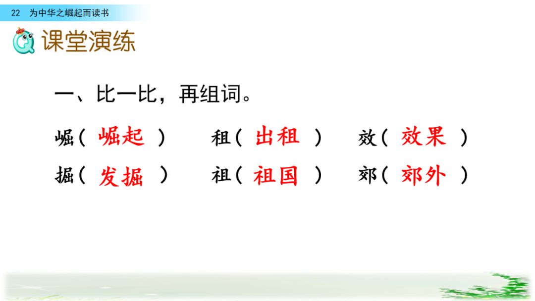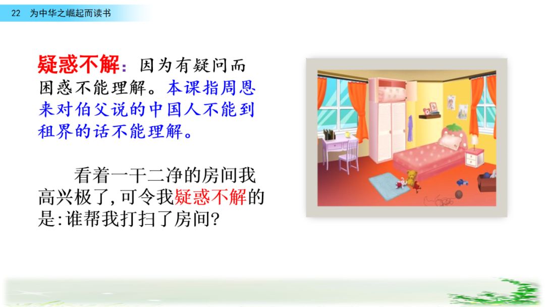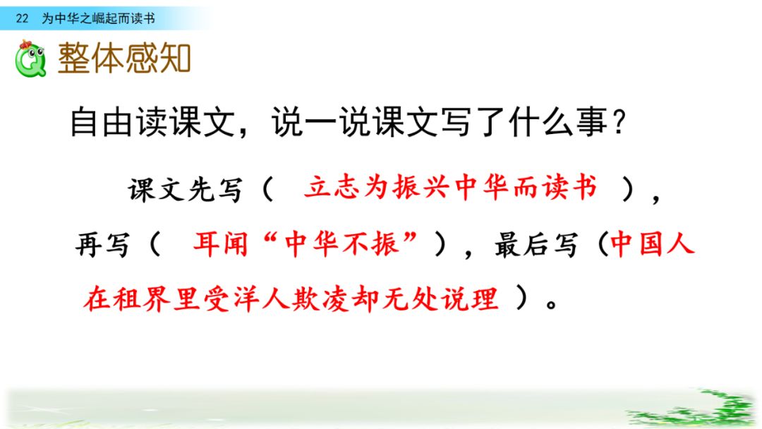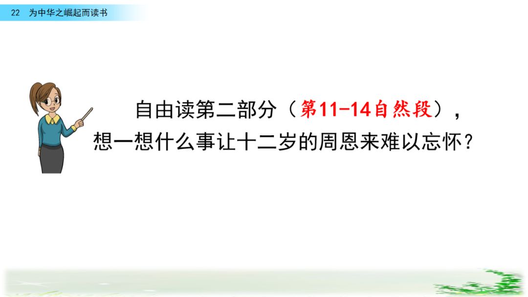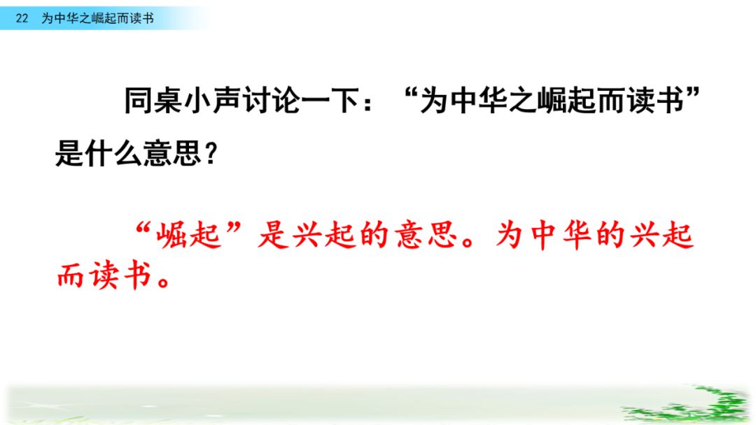 此时的周思来才真正体会到“ 中华不振”这四个字的沉重(chóng zhòng)分量(liang liáng)。怎么把祖国和人民从苦难(nán nàn)和屈辱中拯救出来呢?这个问题像一团(烈 列)火一直燃烧在周思来心中。所以,当修身课上魏校长(提 题)出为什么而读书这个问题时,就有了“为中华之崛起而读书”的响亮回答。