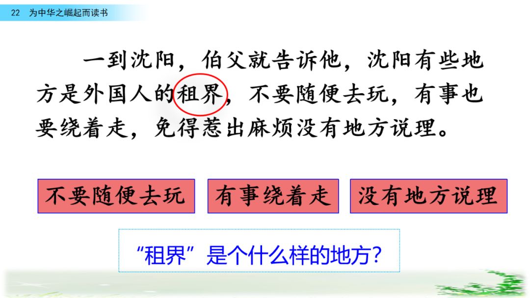 先通过“租界”“洋人”等查阅资料,了解当时的社会状况,再阅读诗句,大体了解诗的意思,进一步体会周恩来之下远大志向的原因。