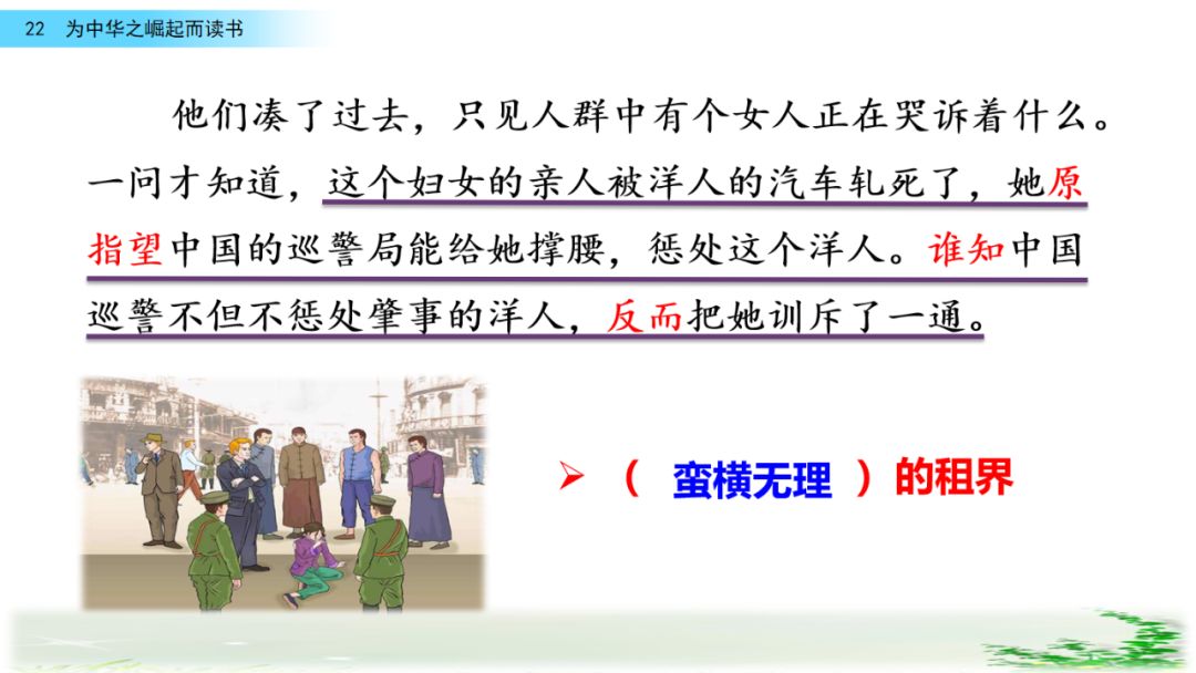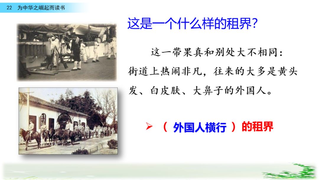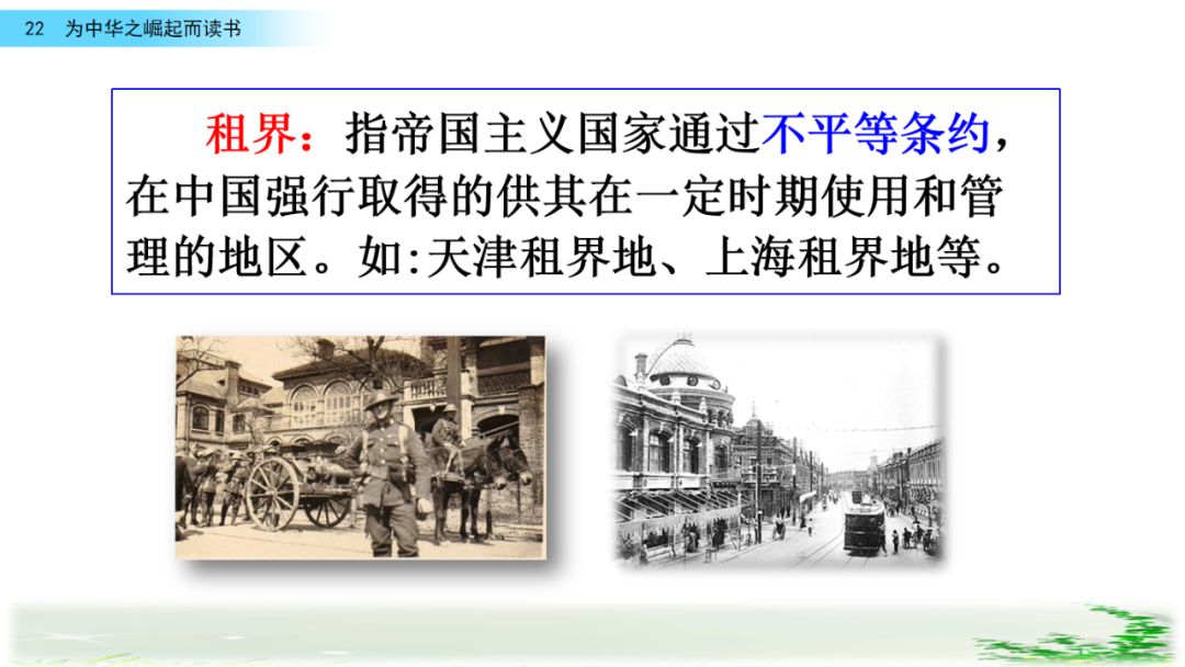 2、课文出现了“租界”、“中华不振”等词语,查阅资料了解当时的社会状况,结合下面的诗句理解周恩来立下如此志向的原因。