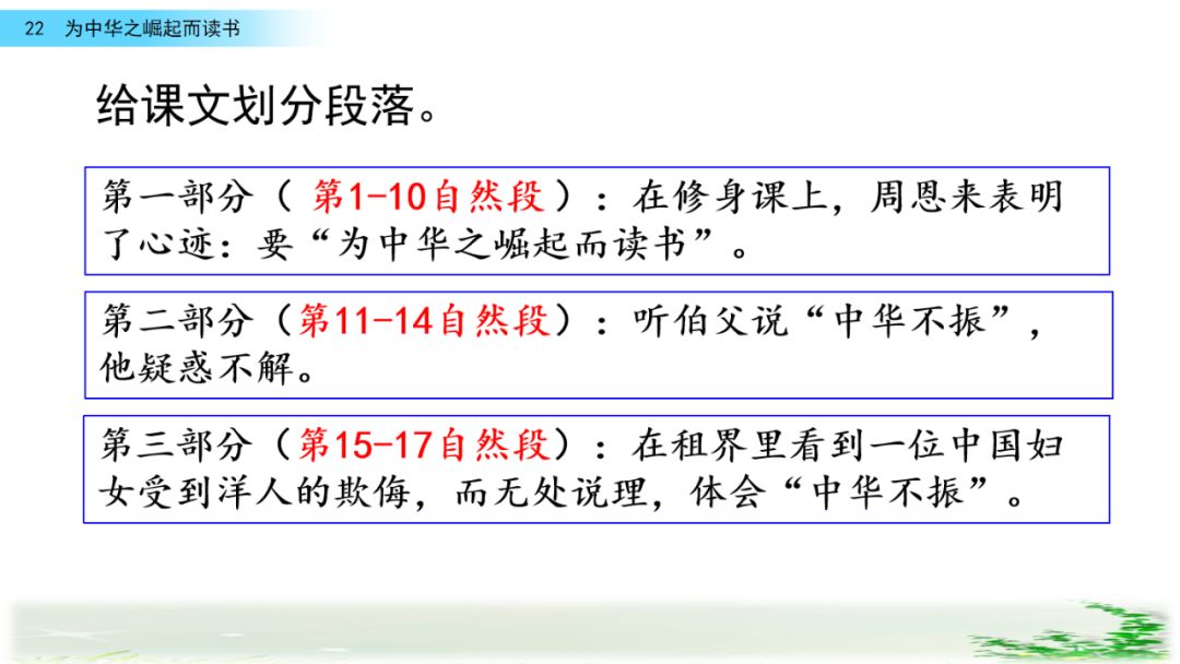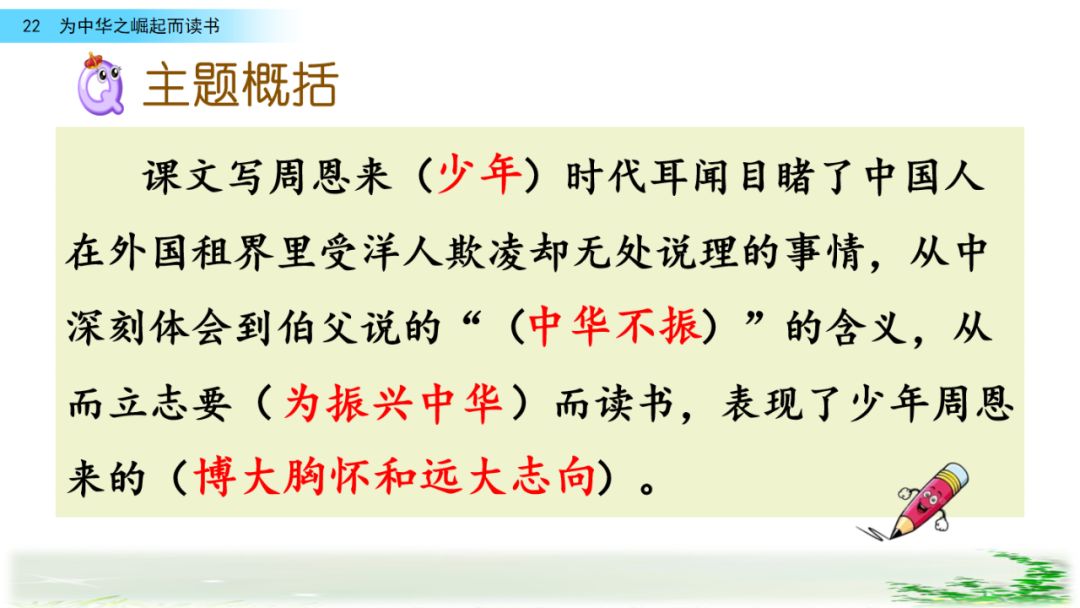 主要内容:课文写周恩来少年时代耳闻目睹了中国人在外国租界里受洋人欺凌却无处说理的事情,从中深刻体会到伯父说的“中华不振”的含义,从而立志要为中华之崛起而读书,表现了少年周恩来的博大胸怀和远大志向。