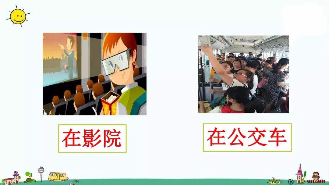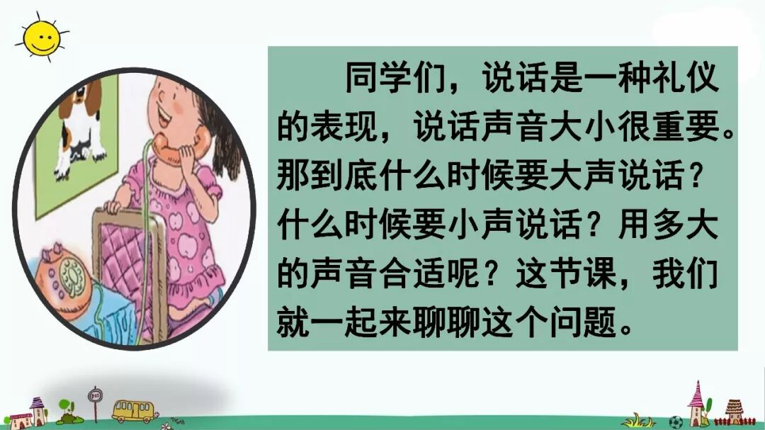 观察三幅图,想想图上画的是什么地方,有什么人,他们在干什么?此时该用多大的声音说话?