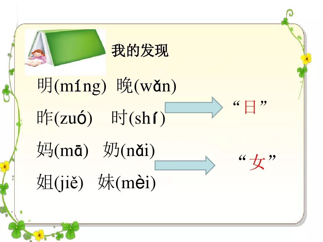 明、晚、昨、时:这些字都有日字旁,都与时光有关。带日字旁的字还有“早、旬、旦”等。