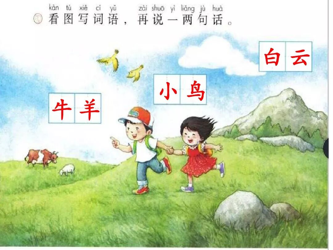 词语:白云 小鸟 小牛 小羊 高兴 高山