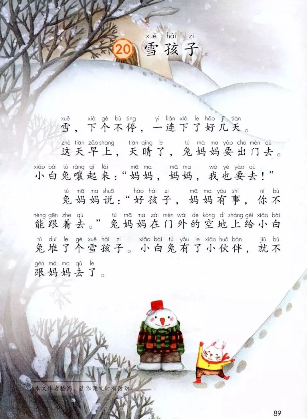 小白兔跳舞给雪孩子看,唱歌给雪孩子听。