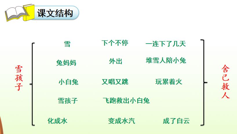 本文写了雪孩子冒着大火救出小白兔,自己却消失了的故事,表现了雪孩子勇敢无畏,舍己救人的优秀品质,表达了人们对雪孩子的赞美之情。