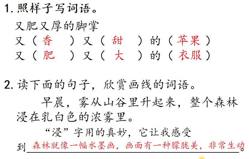 答:“浸”说明小兴安岭的雾很多很浓,覆盖了整个森林。用上“浸”字来形容雾中的森林,使人感到 森林就像一幅水墨画,画面有一种朦胧美,非常生动。