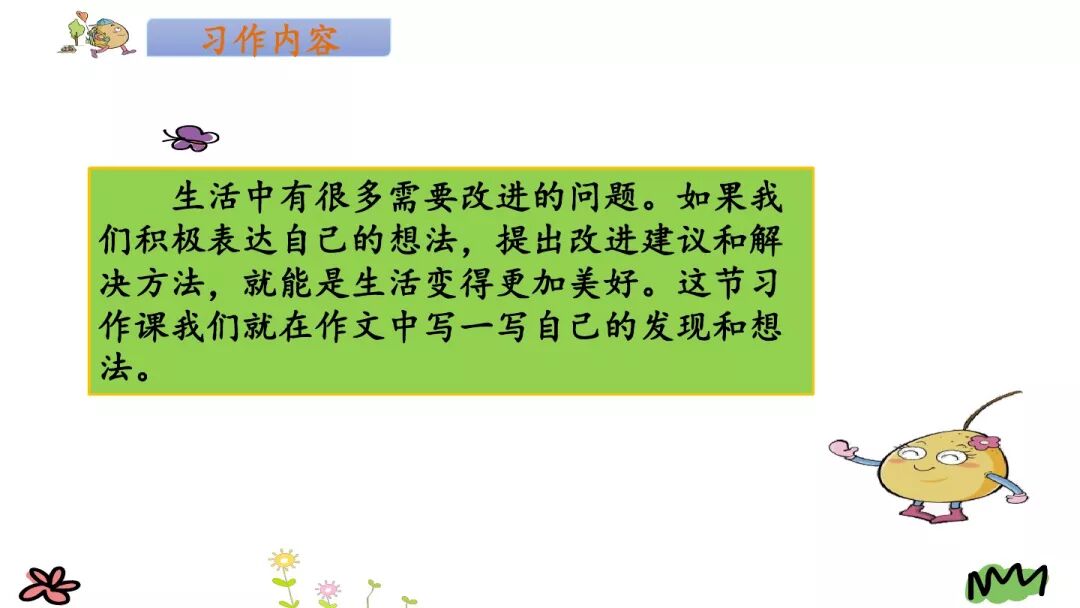 2.写的时候,要把这种现象和你的想法写清楚,有什么改进的办法或建议,也可以写下来。