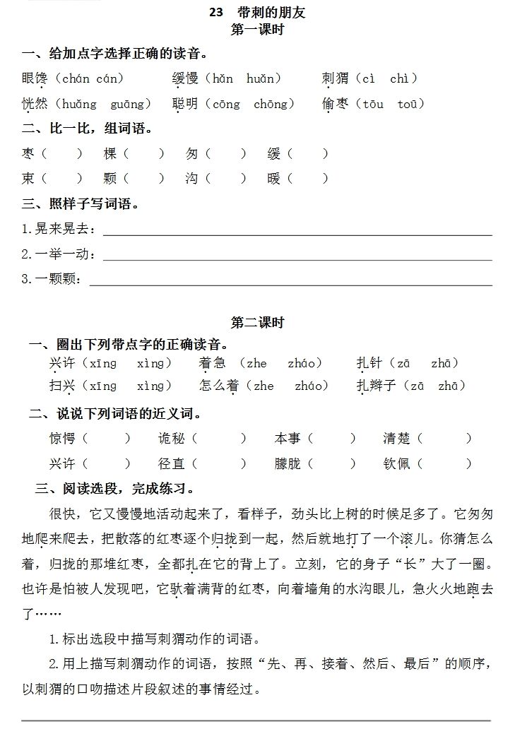 1、朗读课文。找出描写刺猬偷枣的内容,多读几遍,体会生动的语言。