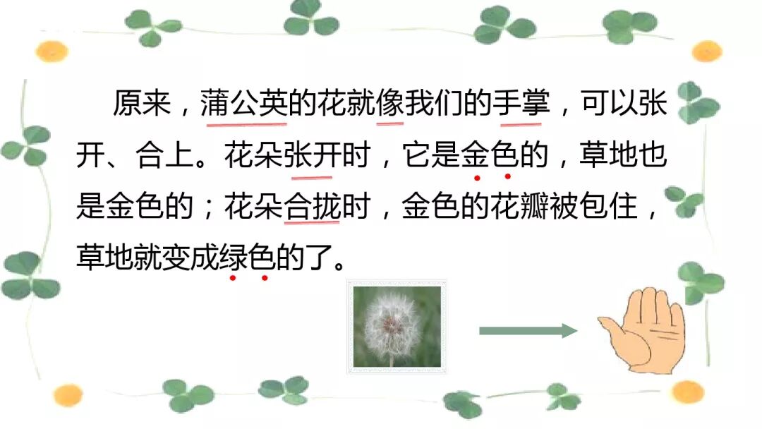 2.原来,蒲公英的花就像我们的手掌,可以张开、合上。花朵张开时,它是金色的,草地也是金色的;花朵合拢时,金色的花瓣被包住,草地就变成绿色的了。