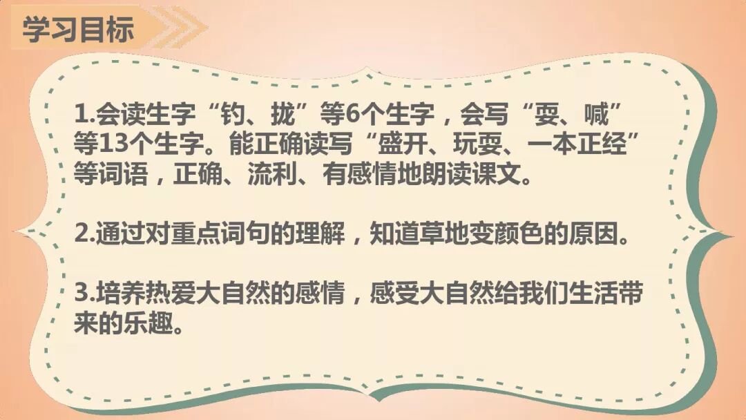本课主要讲了“我”和弟弟在窗前一大片草地上无拘无束、尽情玩耍的情景,以及可爱的草地和有趣的蒲公英不仅给我们的生活带来了快乐。