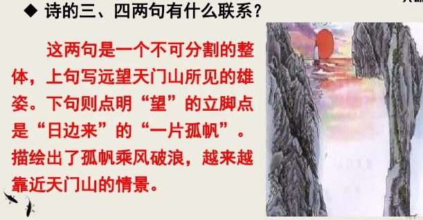 从“孤帆一片日边来”可以知道,作者是在行进的小船上“望”天门山。他正乘风破浪,越来越靠近天门山,此时他看到了“天门中断楚江开,碧水东流至此回”的情景。