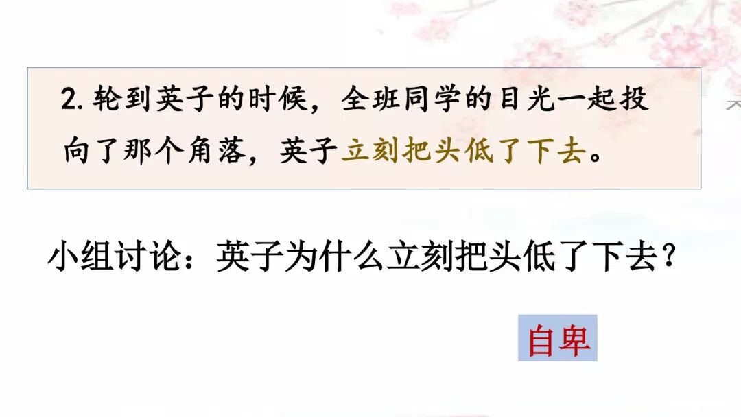 “英子立刻把头低了下去”反映了小英的自卑心理:对别人的目光敏感,不想让别人注意自己,是因为内心不自信,怕别人嘲笑自己。