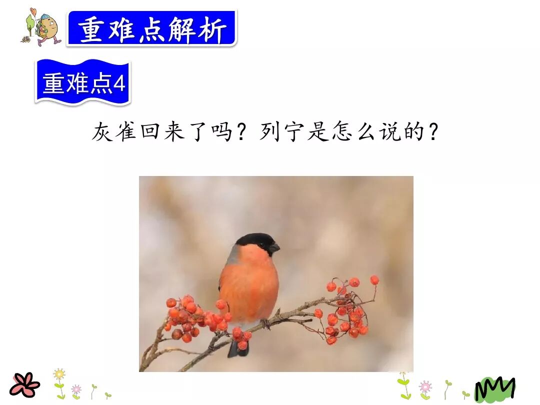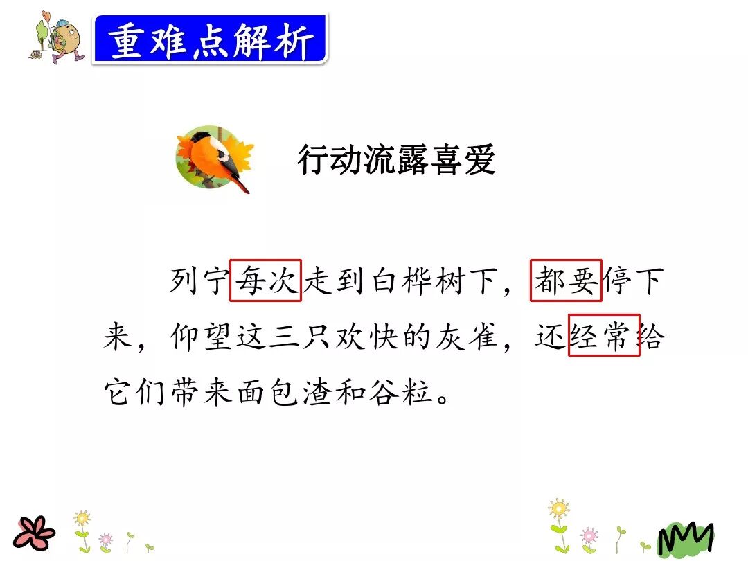 (2)第二天,列宁来到白桦树下, 又看到那只灰雀欢蹦乱跳地在枝头歌唱。