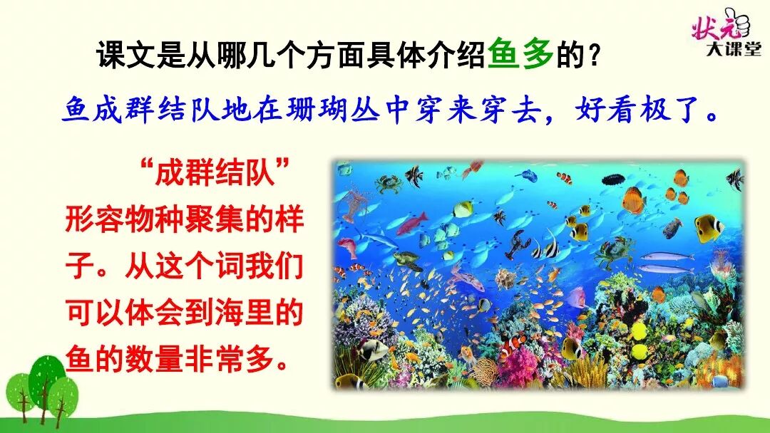 (2)可以从(成群结队)、(各种各样)、(数不清)等词句中看出鱼的数量多。