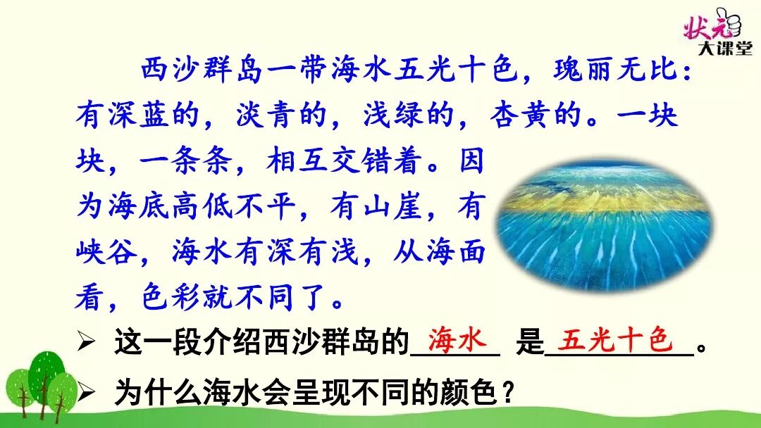 (2)从海面看,色彩就不同,是因为海底高低不平,有山崖,有峡谷,海水有深有浅。