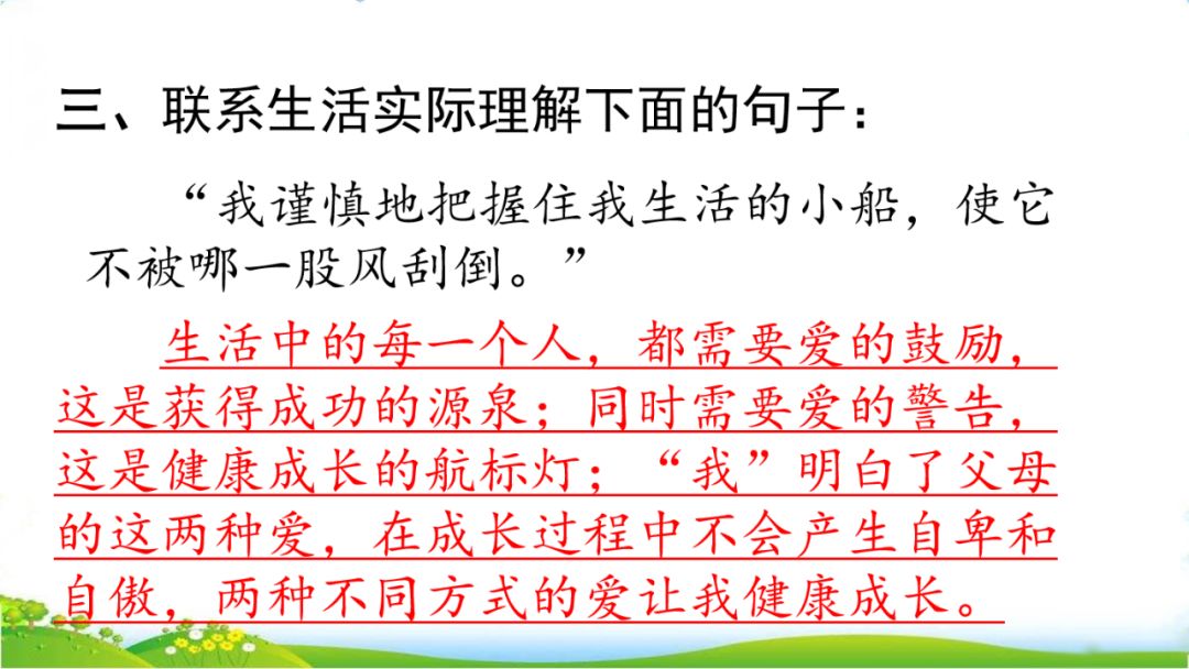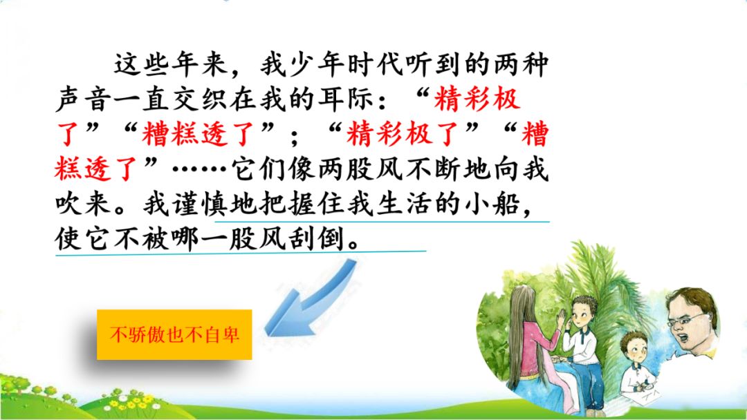 17、这些年来,我少年时代听到的这两种声音一直交织在我的耳际:“精彩极了”,“糟糕透了”;“精彩极了”,“糟糕透了”……它们像两股风不断地向我吹来。我谨慎地把握住我生活的小船,使它不被哪一股风刮倒。我从心底里知道,“精彩极了”也好,“糟糕透了”也好,这两个极端的断言有一个共同的出发点——那就是爱。在爱的鼓舞下,我努力地向前驶去。