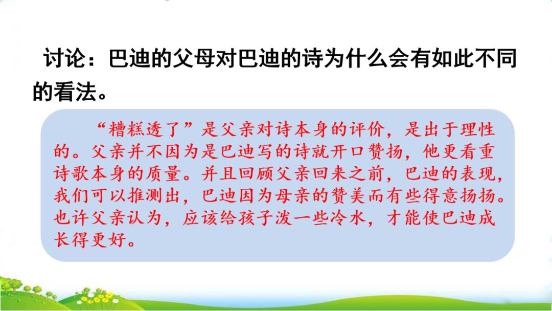 1、当巴迪写了第一首诗后,母亲是怎样评价的?巴迪有什么反应?父亲是怎样评价的?巴迪有什么反应?
