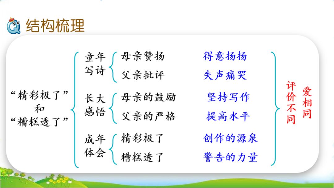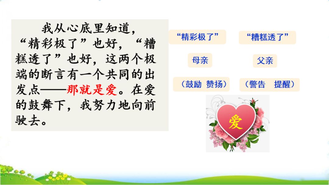 答:成年以后,巴迪越来越体会到父母的两种截然不同的评价在自己的成长中所起的重要作用。母亲的爱是“灵感和创作的源泉”,而父亲的“警告”则时常提醒巴迪“小心,注意,总结,提高”。巴迪不仅认识到“精彩极了”和“糟糕透了”这两种看起来截然不同的评价对自己健康成长的必要性,而且认识到它们都有一个共同的出发点——那就是爱。