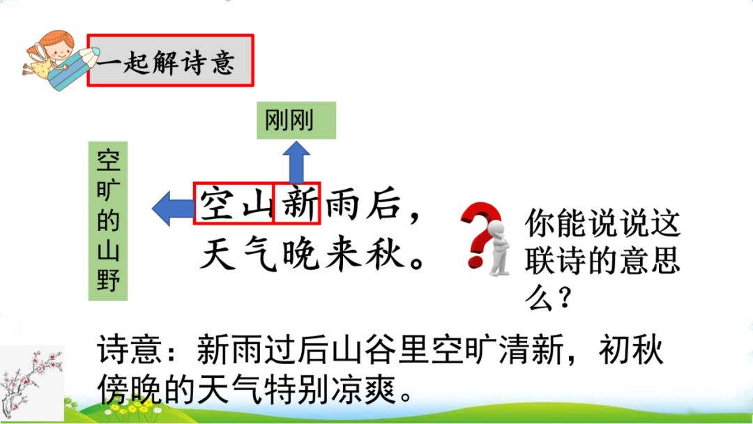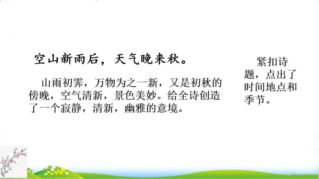开头一个“空”字,点明山间的空旷、寂静。空山之中,一场秋雨刚过,空气洁净而又新鲜,让人感到清爽宁静,心旷神怡。