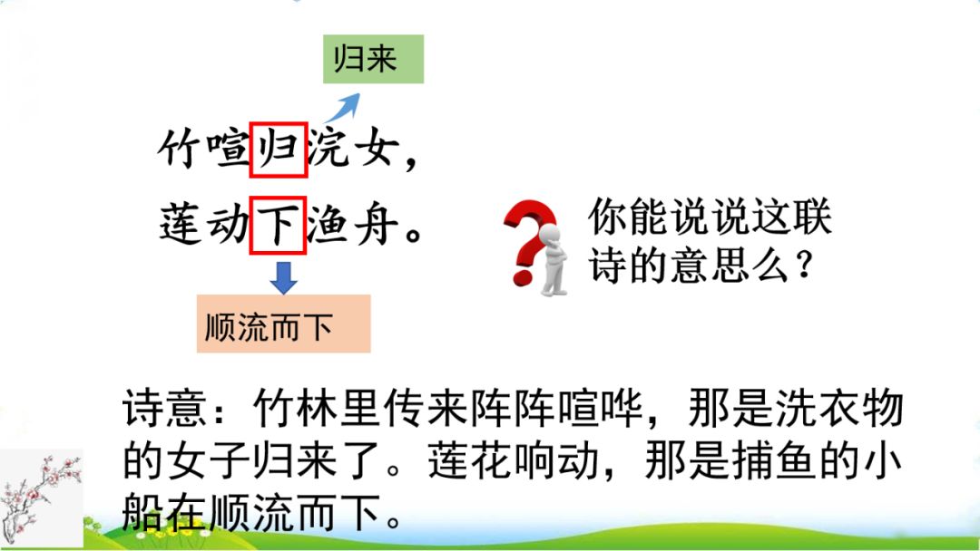 二、1.竹喧 莲动下渔舟 随意春芳 自可留 洗衣物的女子。尽。原指贵族子弟,此处指诗人自己。