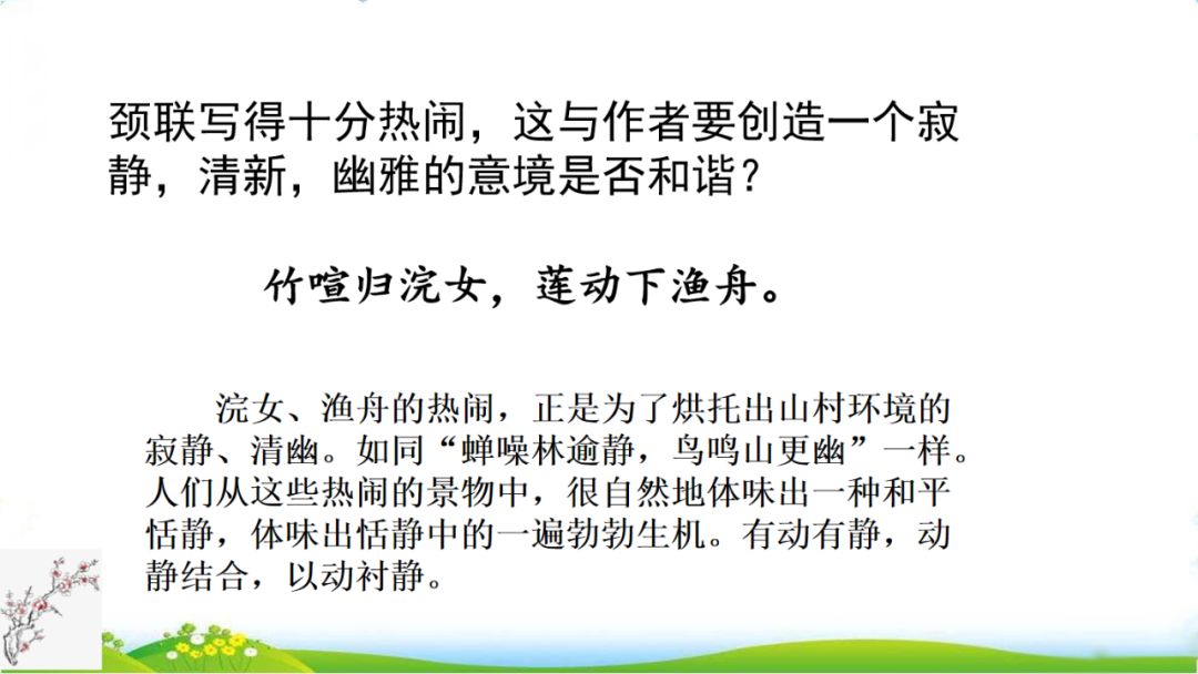 这两句诗是动态描写。浣女、渔舟的热闹,正是为了烘托出山村环境的寂静、清幽。如同“蝉噪林逾静,鸟鸣山更幽”一样。人们从这些热闹的景物中,很自然地体味出一种和平恬静,体味出恬静中的一遍勃勃生机。有动有静,动静结合,以动衬静。