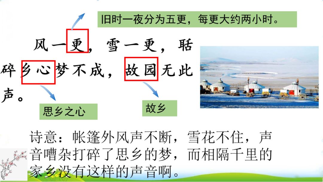 “风一更,雪一更”,以气候引出对将士们的心理描写:睡梦被风雪声打断,思乡之情油然而生,睡意全无。听着帐外的风声雪声,更加怀念故乡的温暖和宁静。